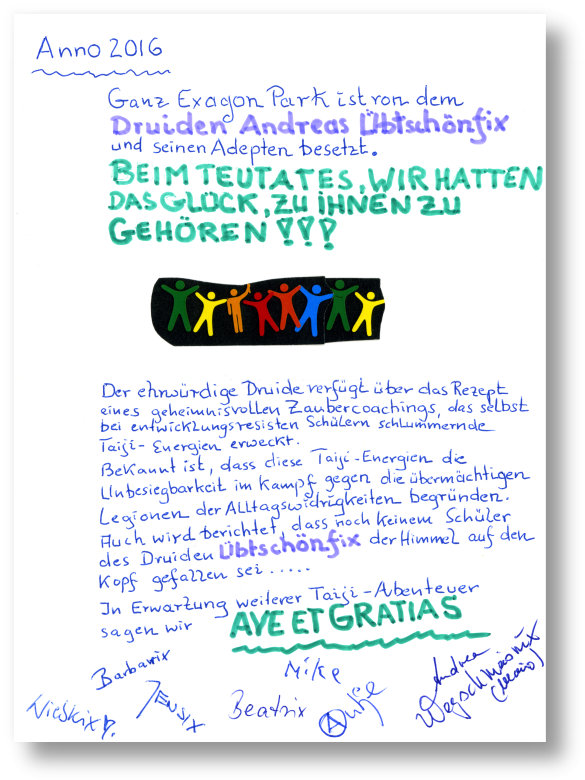 Das lag nicht nur an dem mir schon bekannten gut gewählten Standort, sondern vor allem daran, dass du uns mit deiner großen Offenheit und Liebenswürdigkeit einen anderern, neuen Weg zum Taiji aufgezeigt hast. Ich konnte dadurch die "Matrix des Taiji" erkennen lernen und die Seidenübungen, die stehende Säule oder die Form führen mich jetzt zu mir. ...