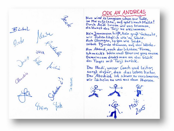 " Lieber Andreas, ... ich habe aus Deinen Unterrichtsstunden schon so viel Gutes für mich 'herausziehen' können, dass sich mein Taiji schon wesentlich verbessert hat! ... Das freut mich riesig und ich möchte es nicht mehr missen. Übrigens sind die Knie- und Fußschmerzen nicht mehr aufgetaucht. Danke Dir dafür! Die Taiji-Malle-Woche ist jedesmal großartig und gibt mir wieder Freude, Entspannung und Beweglichkeit und zeigt mir, warum ich diese einzigartige Kunst so liebe. Danke an Deine lieben Schüler, die Dich auf die Idee gebracht haben, dieses anzubieten! Ich freue mich schon sehr aufs nächste Taiji mit Dir und den anderen Taiji-begeisterten Schülern! "